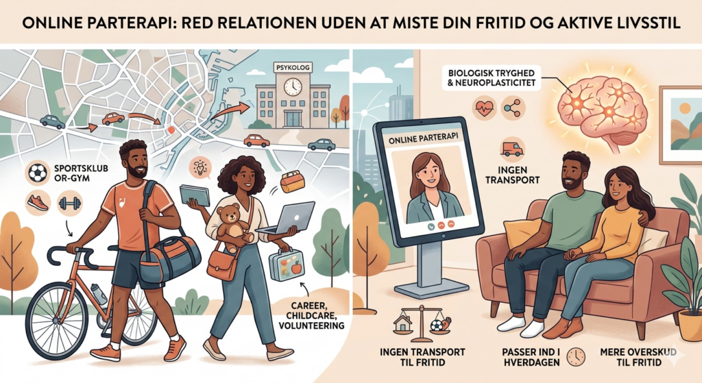 I en moderne hverdag er tid ofte den mest knappe ressource. For mange par består ugen af et komplekst puslespil, hvor karriere, børnepasning, sport og foreningsliv skal gå op i en højere enhed. Når parforholdet begynder at knage, og de svære samtaler udebliver, kan overskuddet til at søge hjælp være minimalt. Tanken om at skulle finde tid i kalenderen til at køre gennem byen til en parterapeut kan i sig selv føles som endnu en stressfaktor, der truer med at vælte læsset.
